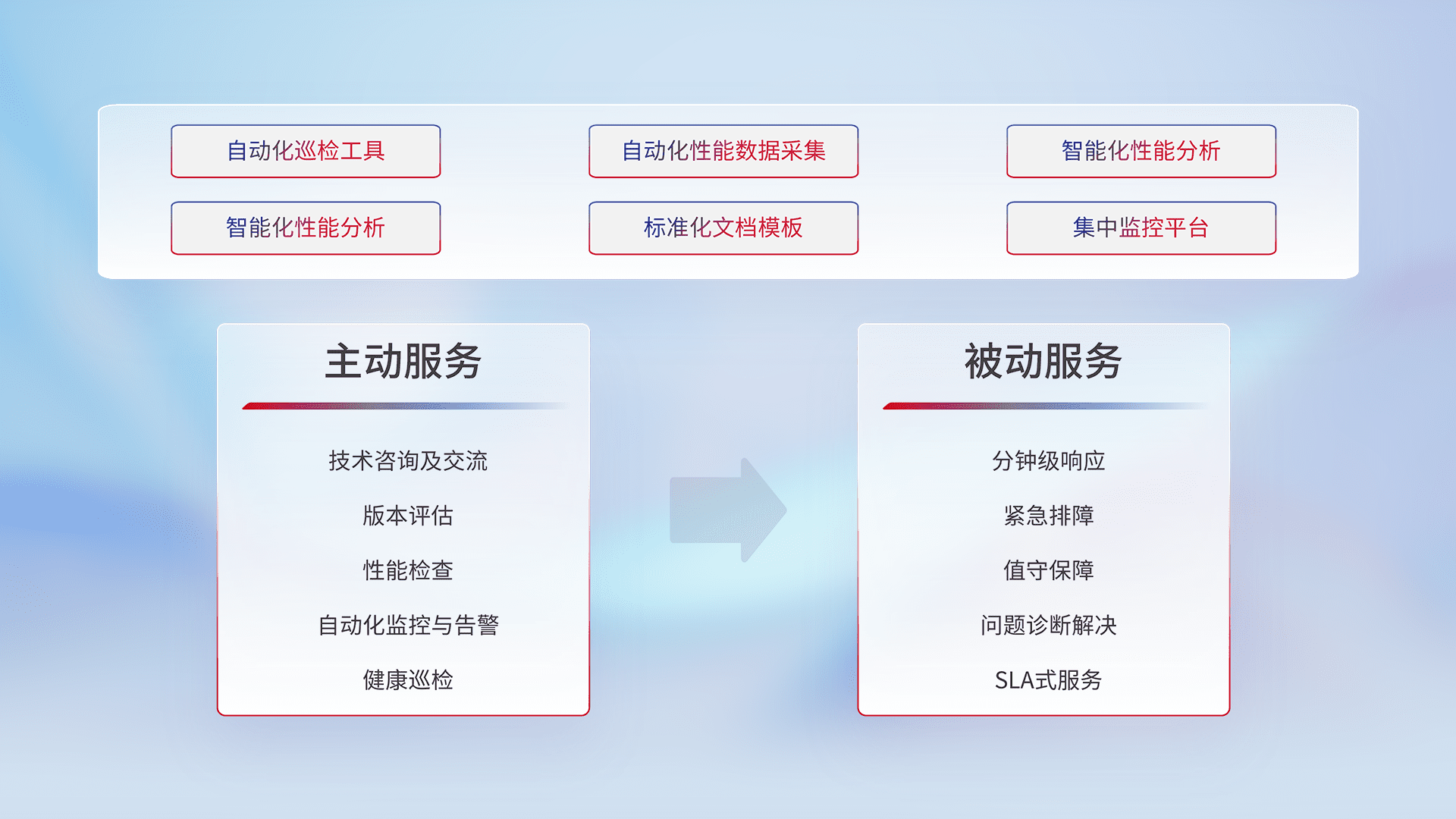 智能化工具和标准化文档,,保障服务质量,,提供主动服务(包含技术咨询、、、、版本评估、、、、性能检查、、、自动化监控与告警、、、健康巡检)和被动服务包含(分钟级响应、、、紧急排障、、、、值守保障、、、、问题诊断解决、、、、SLA服务)。。。