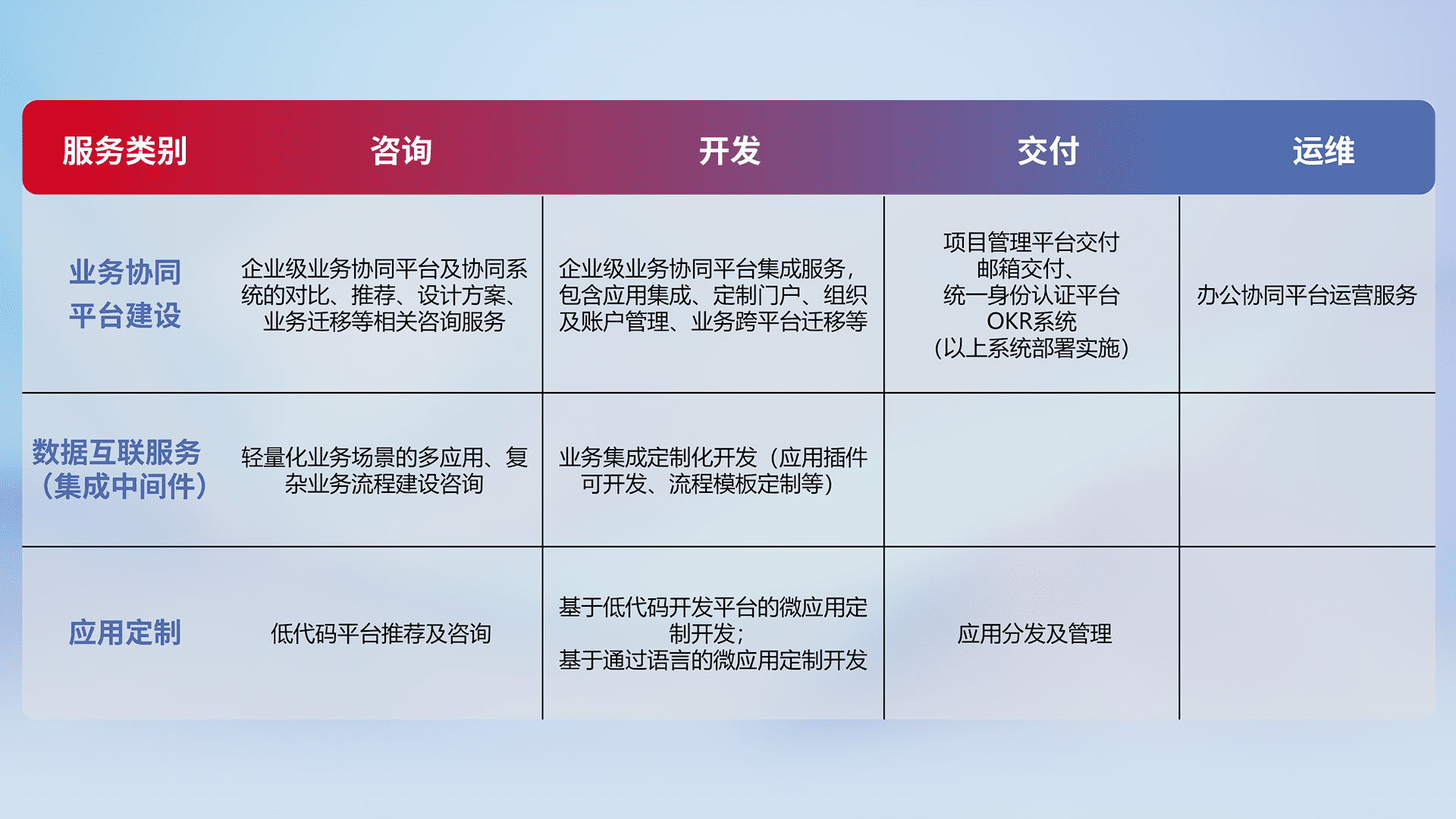针对钉钉、、、、企微、、、IDaas等平台级产品提供产品的规划、、、方案、、、交付、、、、定制化开发等服务,,实现如统一协同办公、、、智能客户服务、、混合会议管理、、智能数据查询、、等业务场景,,实现数字化转型。。。。